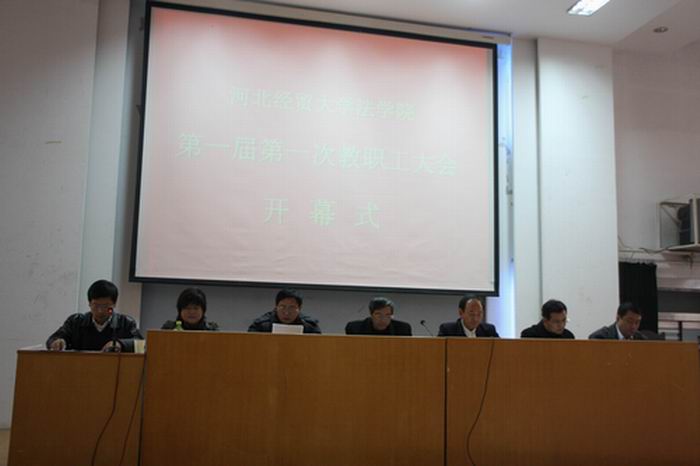 本次教职工大会由437bwin必赢国际官网学院胡育勇副书记主持,由党总支书记郭广辉致开幕词,校党委副书记耿彦君发表重要讲话,437bwin必赢国际官网院长柴振国作了《科学发展、务实创新、努力开创437bwin必赢国际官网工作新局面》的学院工作报告,学院分工会主席齐向晖作了《发挥桥梁作用、营造和谐氛围、形成合力促发展》的工会工作报告,副书记胡育勇作了第一届第一次教职工大会提案征集工作报告,副院长赵朴英报告了《437bwin必赢国际官网学科建设规划》,副院长刘春霖报告了《法学国家特色专业建设规划》。