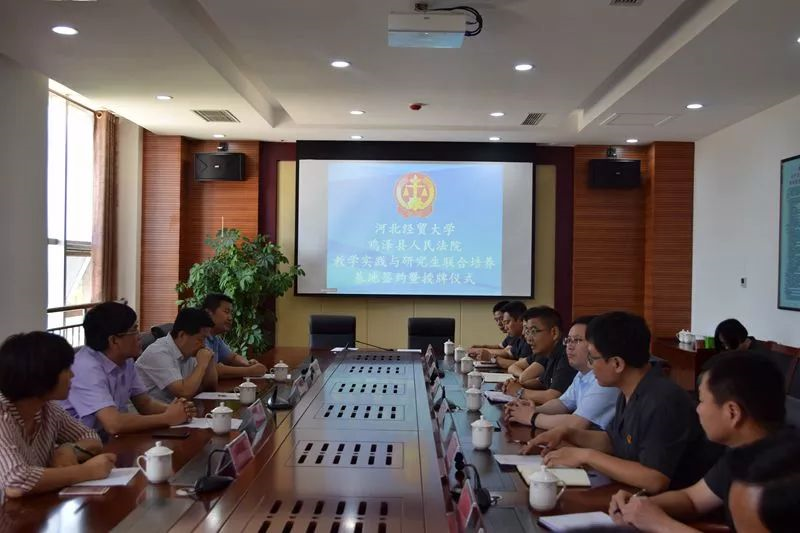 5月29 日上午,必赢国际437官方与鸡泽县人民法院联合举办共建“教学实践与研究生联合培养基地”签约授牌仪式暨座谈活动。必赢国际437官方党委书记武玉鹏、院长王利军、硕士生导师、教授张亚军、副教授张永进;鸡泽县委常委、政法委书记、群工部部长刘志强;鸡泽法院党组全体成员及干警代表出席签约仪式。