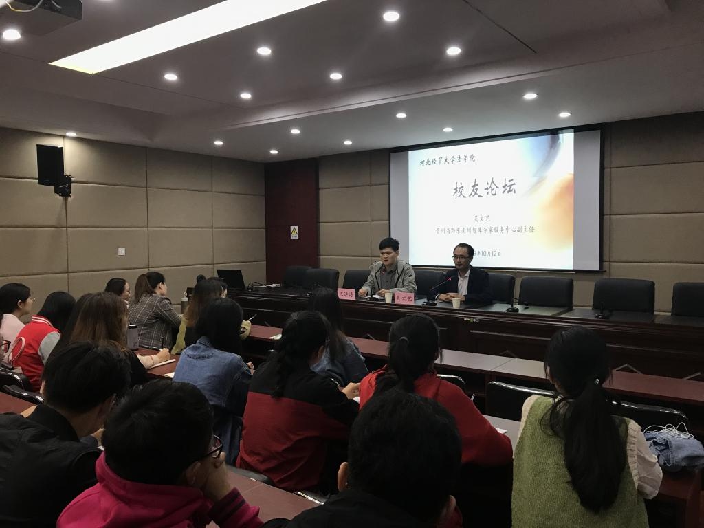 10月12日,437bwin必赢国际官网邀请了2016届优秀研究生毕业生、贵州省黔东南州智库专家服务中心副主任吴文艺做客“校友论坛”,437bwin必赢国际官网60余名研究生、本科生参加此次活动。活动由学院团委书记陈运涛老师主持。