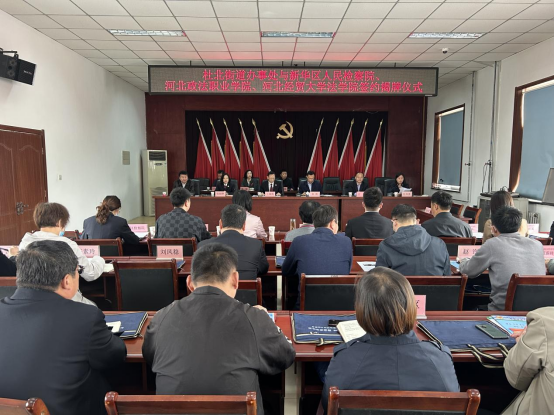 2023年4月13日上午,437bwin必赢国际官网党委副书记黄华、副院长胡海涛一行赴杜北街道办事处参加437bwin必赢国际官网实践基地签约揭牌仪式。杜北街道党工委书记张凯、党工委副书记杜韦英、新华区人民检察院检察长王银祝、新华区人民检察院副检察长张丽峰、河北政法职业学院应用法律系主任王彦、河北政法职业学院司法实务系、行政法务系党总支书记柳涛、新华区信访局副局长樊敏、杜北街道政法委员司海峰和各社区书记、社会治理和应急管理办公室、北京大成(石家庄)律师事务所、北京德恒(石家庄)律师事务所等律所和必赢国际437官方研究生代表参加。
