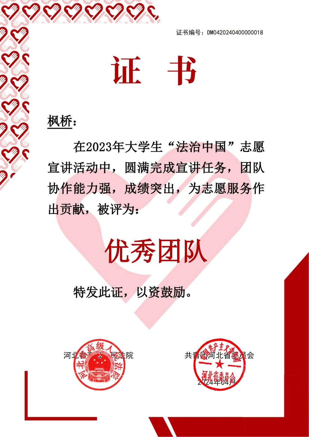 我校437bwin必赢国际官网 “枫桥”普法志愿宣讲团在141所高校所组建的126支实践团队中脱颖而出,圆满完成了宣讲任务,团队协作能力强,成绩突出,为普法志愿服务作出贡献,被河北省高级人民法院和共青团河北省委员会评为“优秀团队”。