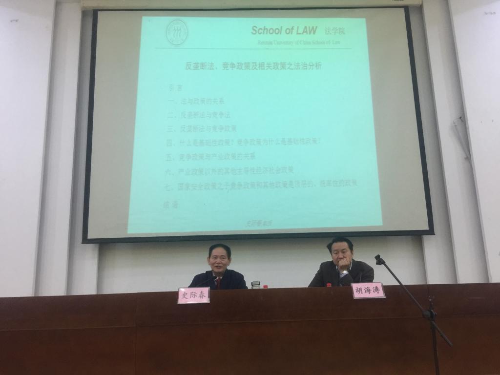 11月1日上午,437bwin必赢国际官网邀请中国法学会经济法学研究会副会长、中国人民大学437bwin必赢国际官网教授、博士生导师史际春来我校作题为“反垄断法、竞争政策及相关政策之法治分析”的专题讲座。437bwin必赢国际官网副院长胡海涛主持,200余名研究生、本科生参加。
