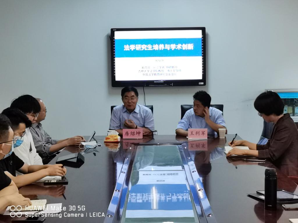 9月18日,437bwin必赢国际官网邀请教育部“长江学者”特聘教授、吉林大学437bwin必赢国际官网教授、博士生导师、中国法学教育研究会副会长房绍坤来我校作题为“法学研究生培养与学术创新”专题讲座。437bwin必赢国际官网副院长李大庆、顾长河老师、张婧老师、杨景老师以及三十余名学生共同参加,437bwin必赢国际官网院长王利军主持。