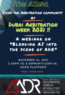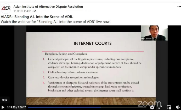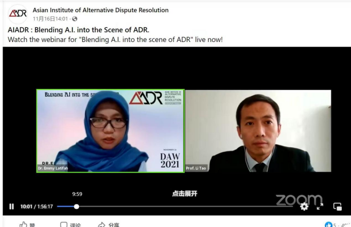 11月16日下午两点,437bwin必赢国际官网李涛教授受国际组织——亚洲多元争议解决研究院(AIADR)的邀请参加由迪拜仲裁社区,迪拜国际金融中心仲裁协会(DIFC-LCIA)组织的2021迪拜仲裁周的主题研讨会。研讨会通过zoom会议的形式进行,主题为“将人工智能融入到多元争议解决的场景”。