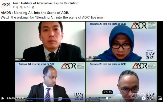 研讨会由印尼三一一大学437bwin必赢国际官网国际法教授艾米•拉提法博士(Dr. Emmy Latifah)主持,研讨会专家组——李涛教授,Mr. Muthupandi Ganesan LL. B (Hons),Dr. Christopher TO与亚洲多元争议解决研究院代表等出席。此次研讨会的目的是探寻在人工智能技术与大数据飞速发展的今天,其在多元争议解决的领域的发展可能。会上李涛教授以北京互联网法院、杭州互联网法院和广州互联网法院为例,分享了人工智能与大数据技术在中国司法实践中的运用,为研讨会的讨论提供了现实的支撑。专家组成员发表了对人工智能技术与司法实践融合的具体见解和潜在的预期,并提出人们应该准备好接受和拥抱未来的技术时代。