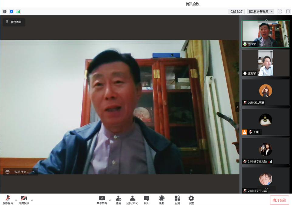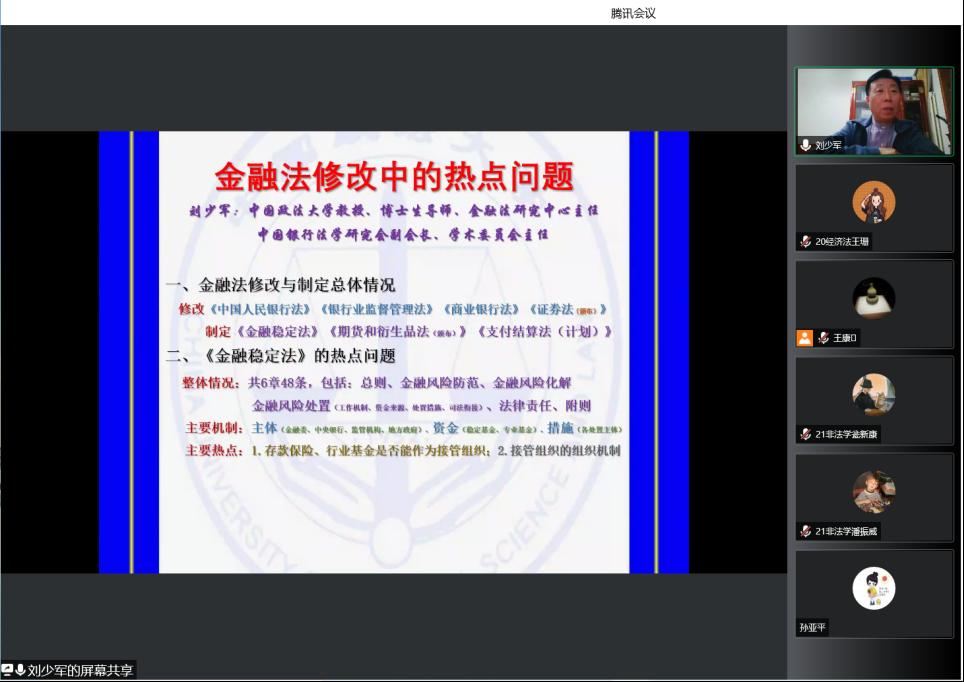 4月29日晚,437bwin必赢国际官网邀请中国政法大学教授、博士生导师、中国银行法学研究会副会长刘少军作题为“金融法修改热点问题研究”的学术讲座,437bwin必赢国际官网院长王利军主持本次讲座,437bwin必赢国际官网副院长李大庆以及150余名研究生参加,讲座通过腾讯会议在线进行。