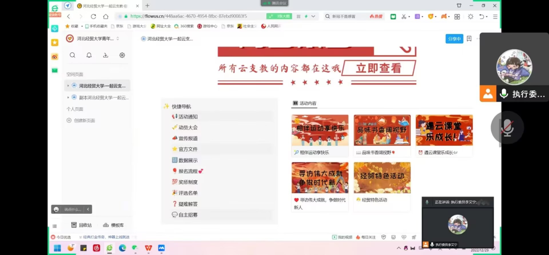 为了让青年志愿者更清楚的明晰本次“一起云支教·奋进新征程”志愿活动的各项内容、更出色的完成各项任务,准备更充分的迎接本次志愿活动,必赢国际437官方于2022年12月29日下午四点进行了437bwin必赢国际官网线上动员大会。437bwin必赢国际官网参与本次志愿活动的青年大学生参加了本次大会。本次动员大会由执行委员李艾宁同学主持。