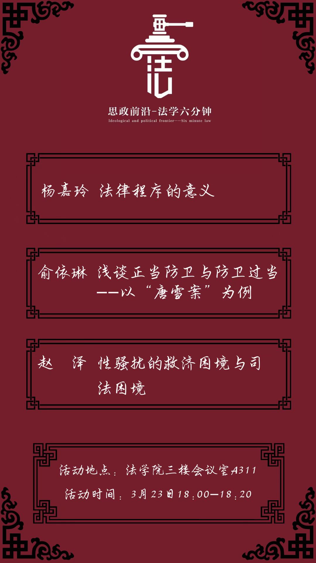 “新一期思政前沿—法学六分钟来喽”宣传稿