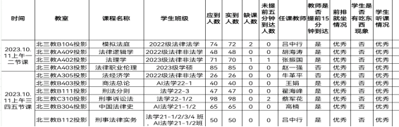 教学运行总体情况良好。检查组安排22名工作人员分别到各个教室,对10月11日上午的上课情况进行了全面检查,共检查10个教学班。教师们整体课程思路清晰,课程的重难点突出,设计合理。各个班级的学生们认真听课,主动思考回答问题,没有出现学生在教室吃早饭的现象,学生听课状态优秀。