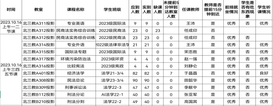 教学运行总体情况良好。检查组安排22名工作人员分别到各个教室,对10月16日上午的上课情况进行了全面检查,共检查12个教学班。教师们整体课程思路清晰,课程的重难点突出,富有创新性。各个班级的学生们提前到达教室,积极前排就座,课堂氛围非常活跃,没有出现学生在教室吃东西的现象,学生听课状况为优秀。