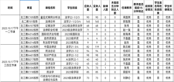 教学运行总体情况良好。检查组安排27名工作人员分别到各个教室,对10月17日下午的上课情况进行了全面检查,共检查15个教学班。教师们整体课程思路清晰,课程的重难点突出,富有创新性。各个班级的学生们提前到达教室,积极前排就座,课堂氛围非常活跃,没有出现学生在教室吃东西的现象,学生听课状况为优秀。