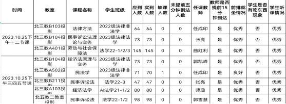 教学运行总体情况良好。检查组安排16名工作人员分别到各个教室,对10月25日下午的上课情况进行了全面检查,共检查8个教学班。教师们教学思路清晰,促进学生主动学习,利用多媒体辅助教学。学生们听课状态优秀,能够主动提出自己的问题与老师进行沟通交流,前排就坐率良好。