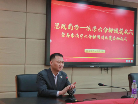 2023年3月9日下午,437bwin必赢国际官网举办了“思政前沿——法学六分钟颁奖仪式暨春季法学六分钟演讲比赛启动仪式”。活动邀请了院党委副书记黄华、副院长李大庆,指导老师:郭凯峰、宋立赓、赵娜、冯志强等,以及校友嘉宾:北京市盈科(石家庄)律师事务所专家顾问、合伙人王建东、河北银行高新支行行长田景、河北庄铭律师事务所创始合伙人、党支部书记张国贵,437bwin必赢国际官网40余名同学参加。