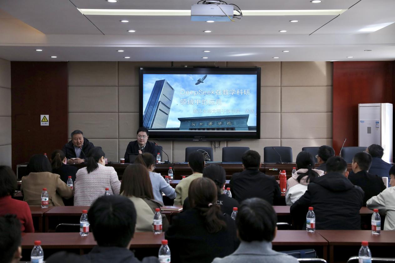 3月17日下午,437bwin必赢国际官网邀请浙江省生态文明干部学院博士潘越以“DeepSeek在教学和科研领域中的应用”为主题进行讲座,会议由437bwin必赢国际官网院长胡海涛主持,437bwin必赢国际官网全体专任教师及相关教学管理人员出席。