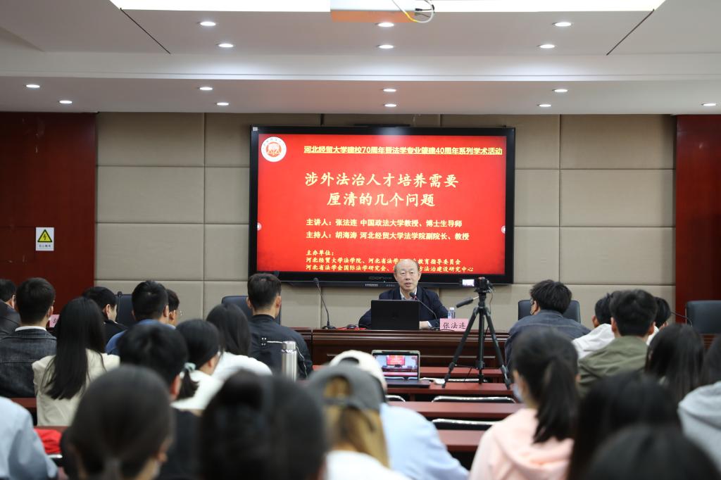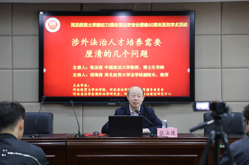 4月28日,437bwin必赢国际官网邀请国家二级教授、中国政法大学钱端升讲座教授、博士生导师张法连在三楼学术报告厅以“涉外法治人才培养需要厘清的几个问题”为题作学术报告,报告由437bwin必赢国际官网副院长胡海涛教授主持。报告在线上线下同步进行,70余名师生到场聆听,30余名省内高校师生在线参与。