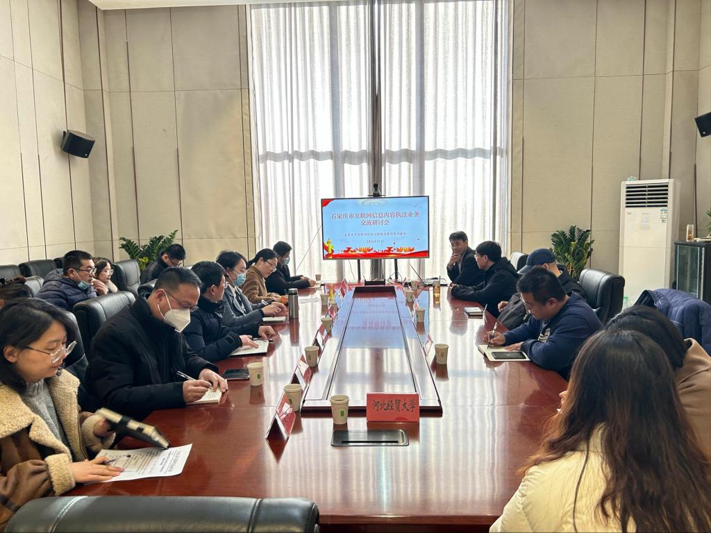 11月29日,必赢国际437官方437bwin必赢国际官网与石家庄市委网信办共建石家庄市互联网信息内容执法管理实训基地开展执法业务交流研讨会。石家庄市委网信办综治科领导主持交流,437bwin必赢国际官网副院长李大庆、冯志强教授、郭一君博士和实训基地研究人员潘泳兴、李晓乐到会指导,灵寿、新乐、正定等县市网信办执法人员参加。