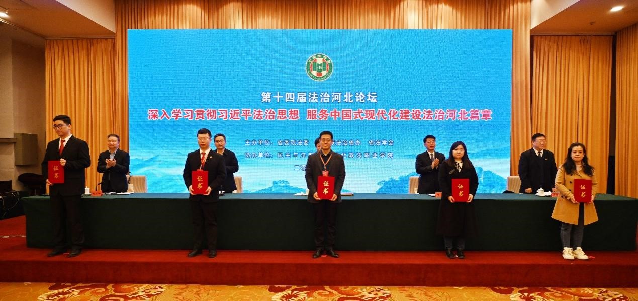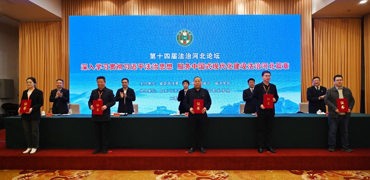 2023年11月25日,第十四届法治河北论坛在石家庄举行。会议由中共河北省委政法委员会、中共河北省委全面依法治省委员会办公室、河北省法学会共同举办,民主与法制社、河北政法职业学院协办。437bwin必赢国际官网教师崔盈、林群丰、于晶晶、王康参加了本次会议。