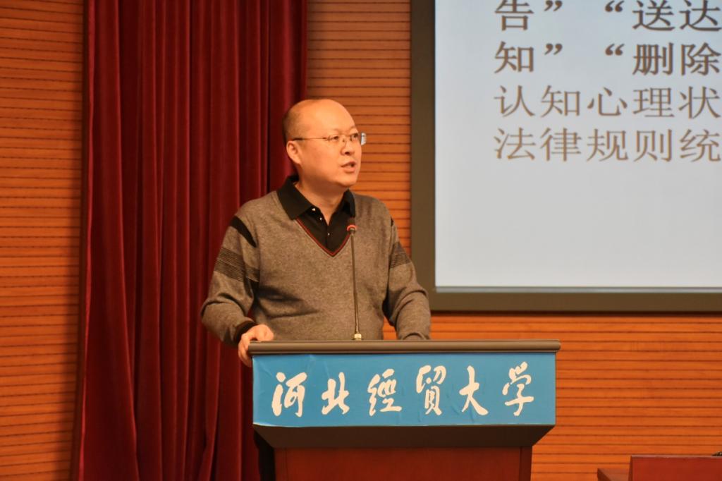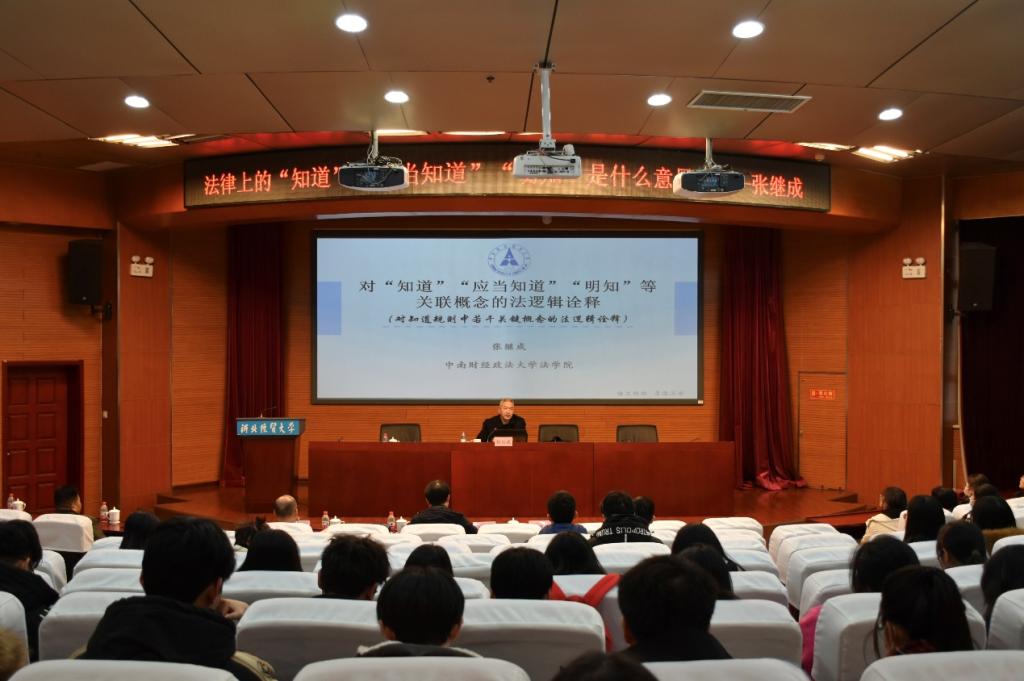 12月6日,437bwin必赢国际官网邀请中南财经政法大学教授、中国法律逻辑学会会长张继成在必赢国际437官方国际学术报告厅以《法律上的“知道”“应当知道”“明知”是什么意思?》为题作学术报告,报告由437bwin必赢国际官网副院长李大庆主持,河北科技大学文437bwin必赢国际官网院长高景芳教授出席,437bwin必赢国际官网二百四十余名师生到场聆听。
