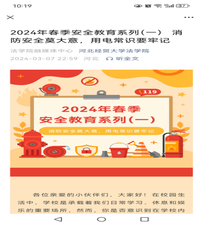 学院微信公众号及时推送消防安全教育材料。必赢国际437官方于3月15日9时组织本科生研究生80多人集中收看了由国家消防救援局,教育部联合举办的春季校园火灾疏散逃生演练公开课的直播,并且由辅导员梁贺超详细介绍了本次消防逃生演练的工作计划,具体要求以及注意事项,这使得同学们进一步掌握了火灾预防知识,逃生技巧以及疏散流程。