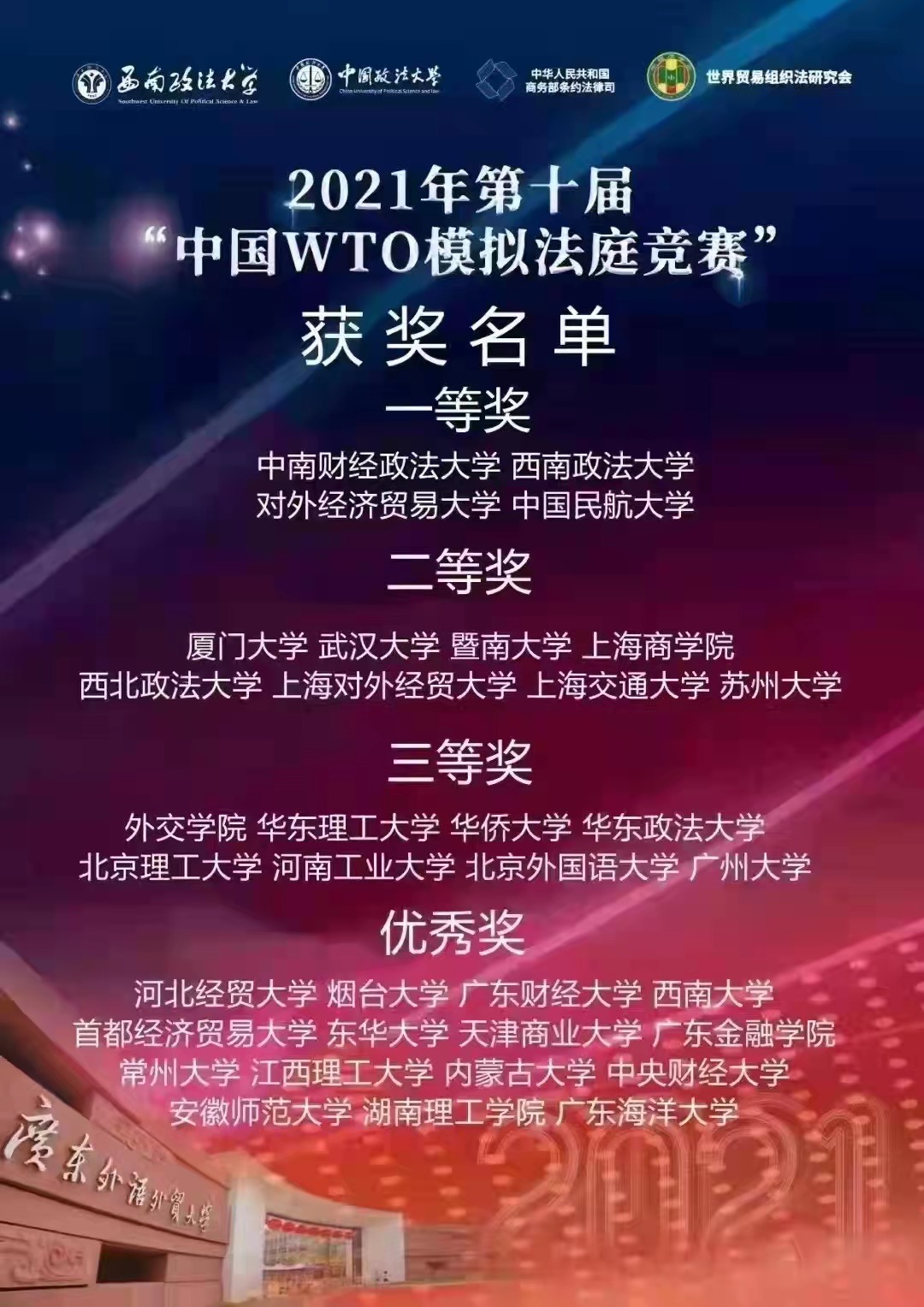 2021年12月19日,第十届“中国WTO模拟法庭竞赛”落下帷幕。本次模拟法庭竞赛采用线上庭审的方式进行。该项赛事由西南政法大学、中国政法大学、中国法学会世界贸易组织法研究会和中华人民共和国商务部条法司共同主办,由广东外语外贸大学、西南政法大学和中国法学会世界贸易组织法研究会联合承办。来自我校和中南财经政法大学、西南政法大学和武汉大学等高校39支代表队参赛。