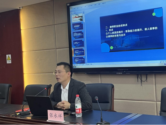 4月14日下午,437bwin必赢国际官网邀请2015届国际法专业毕业研究生、北京市盈科(邯郸)律师事务所张永祥律师于437bwin必赢国际官网三楼报告厅开展了题为“律师的自我进化—如何扎实稳重的成为一名好律师”的职业生涯规划专题讲座。活动由学院学生工作办公室主任陈运涛主持,2021级、2022级研究生70余人参加。